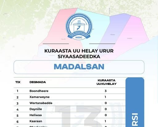 Ururka siyaasadeedka Madalsan wuxuu doorashada Golaha Deegaanka Gobolka Banaadir ka helay 13 kursi, sida ku…