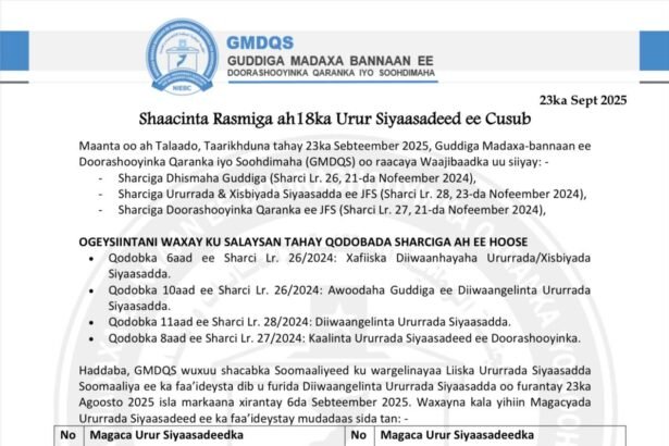 Soohdimaha (GMDQS) waxa uu Maanta oo ay Taarikhdu tahay 23, 9,2025, si rasmi ah u…