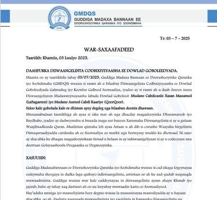Maanta oo ay taariikhdu tahay 03/07/2025, Guddiga Madaxa Bannaan ee Doorashooyinka Qaranka iyo Soohdimaha (GMDQS)…