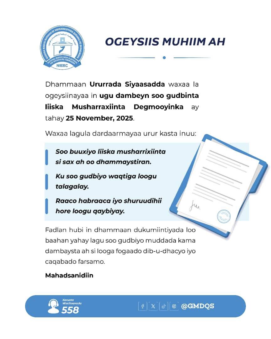Blog Dhammaan ururrada siyaasadda waxaa la ogeysiinayaa in ugu dambayn….. December 16, 2025 4:37 pm introvertmustafaByintrovertmustafa Share 0 Min Read soo gudbinta liiska murashaxiinta degmooyinka ay ku egyahay 25,November 2025. Share This Article Facebook Bluesky Copy Link Leave a Comment Leave a Comment Leave a Reply Cancel replyYour email address will not be published. Required fields are marked *Comment * Name * Email * Website Save my name, email, and website in this browser for the next time I comment. FacebookLikeYoutubeSubscribeBlueskyFollowRSS FeedFollowLastest Stories Warbixinta Doorashadii Taariikhiga ahayd ee Gobolka Banaadir Kdhacday (Dec 2025) – Soomaaliya oo in ka badan 50 sano kaddib dib ugu laabatay Doorasho Qof iyo Cod ah (tan iyo 1969) February 6, 2026 KURAASTA UU HELAY URUR SIYAASADEEDKA HORYAL QARAN. January 5, 2026 KURAASTA UU HELAY URUR SIYAASADEEDKA January 5, 2026 KURAASTA UU HELAY URUR SIYAASADEEDKA Dimuqraadiga Soomaaliyeed January 5, 2026 - Advertisement -