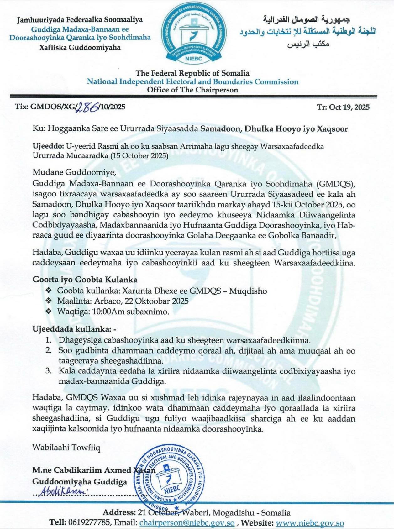 Soohdimaha (GMDQS), isagoo tixraacaya warsaxaafadeedkii ay soo saareen ururrada siyaasadeed ee kala ah Samadoon, Dhulka Hooyo, iyo Xaqsoor taariikhdu markay ahayd 15-kii Oktoobar 2025, kaas oo lagu soo bandhigay cabashooyin iyo eedeymo la xiriira nidaamka diiwaangelinta codbixiyayaasha, madaxbannaanida iyo hufnaanta Guddiga Madaxa Bannaan ee Doorashooyinka iyo Soohdimaha iyo sidoo kale hab-raaca guud ee diyaarinta doorashooyinka golayaasha deegaanka ee Gobolka Banaadir.
