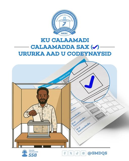 Si codkaagu u noqdo mid ansax ah, fadlan raac tilmaantan fudud: Raadi magaca iyo astaanta ururka aad taageeraysid, ka dib ku calaamadee calaamadda saxda ah (✓) sanduuqa bannaan ee ku hor yaalla. Hubi inaad doorato hal urur oo kaliya, adigoo iska ilaalinaya inaad wax ka badan hal calaamad saarto si aan codkaagu u hallaabin. Waa muhiim in calaamaddu ay ku dhex jirto laynka loogu talagalay si loo hubiyo hufnaanta doorashadaada. Codkaagu waa mustaqbalka degmadaada, ee si xilkasnimo leh u dhiibo.