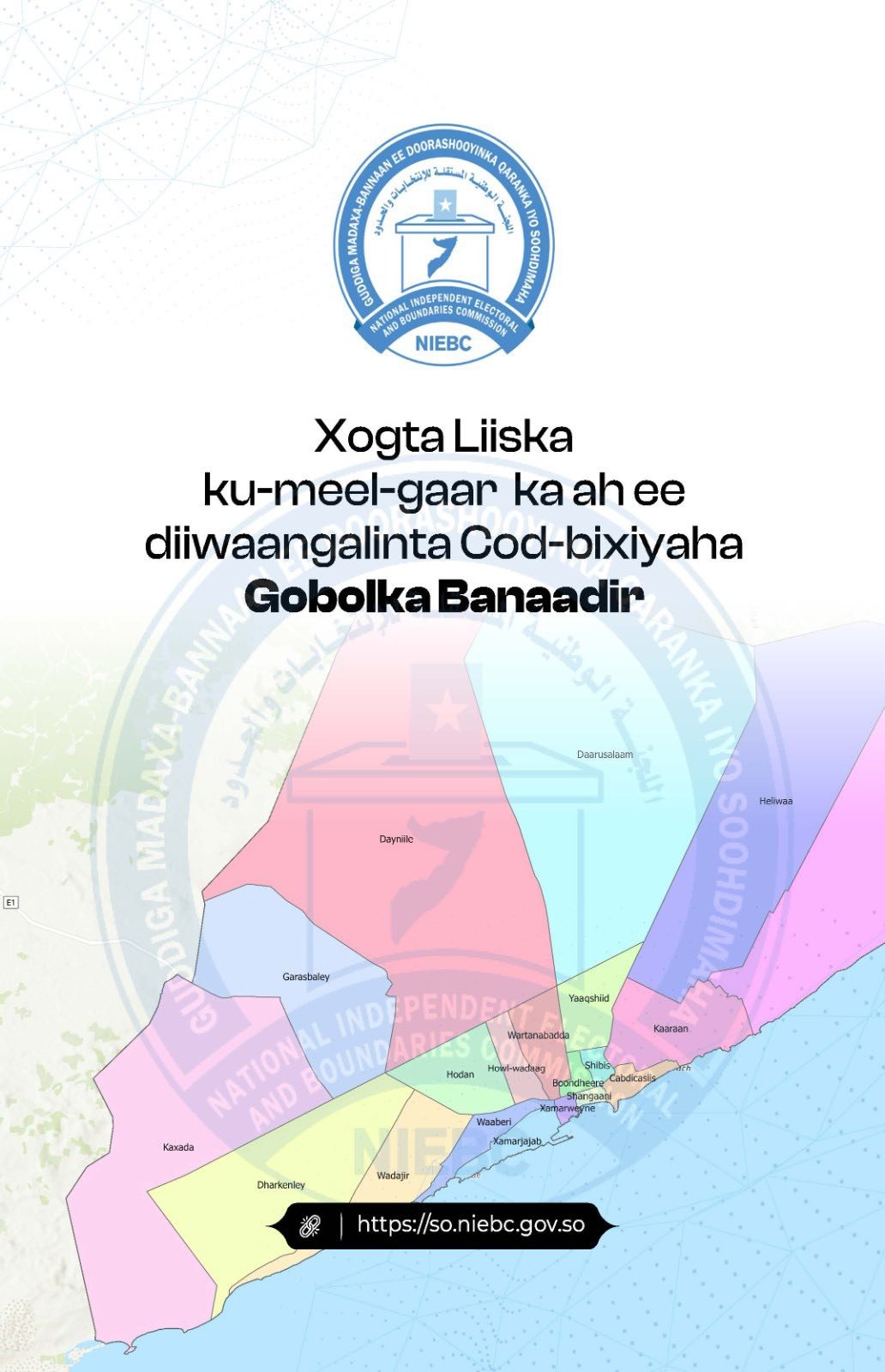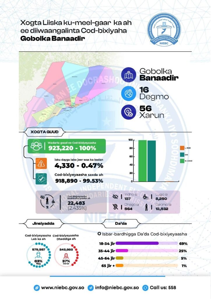 Electoral Commission and Province announced the 19th KMG list of registered voters in Banaadir region, in accordance with Qod. 34th National Electoral Act, so that citizens can monitor and resolve their complaints if there is any. errors related to their personal data, such as area, registration and voting location, in accordance with Qod. 31st National Electoral Act. Citizens, you can contact GMDQS office or call the short number 558 following the instructions given to the operators of the Independent National Electoral Committee. Citizen the period of resolving the complaints is 30 October 2025.
