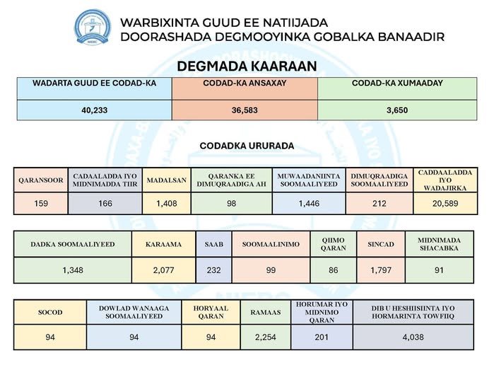 Degmada Kaaraan ayaa si rasmi ah u soo gabagabeysay doorashadii Golaha Deegaanka ee Gobolka Banaadir. Wadarta guud ee codadka la dhiibtay waxay ahayd 40,233, kuwaas oo 36,583 ay noqdeen codad ansax ah, halka 3,650 cod ay noqdeen kuwo xumaaday.