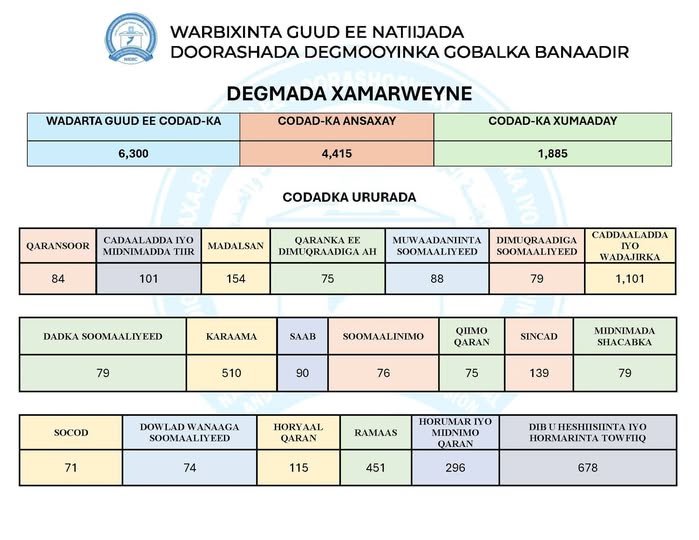 Degmada Xamarweyne ayaa si rasmi ah u soo gabagabeysay doorashadii Golaha Deegaanka ee Gobolka Banaadir. Wadarta guud ee codadka la dhiibtay waxay ahayd 6,300, kuwaas oo 4,415 ay noqdeen codad ansax ah, halka 1,885 cod ay noqdeen kuwo xumaaday.