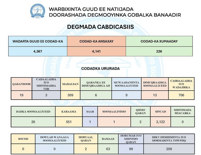 Degmada Cabdicasiis ayaa si rasmi ah u soo gabagabeysay doorashadii Golaha Deegaanka ee Gobolka Banaadir. Wadarta guud ee codadka la dhiibtay waxay ahayd 4,367, kuwaas oo 4,141 ay noqdeen codad ansax ah, halka 226 cod ay noqdeen kuwo xumaaday.