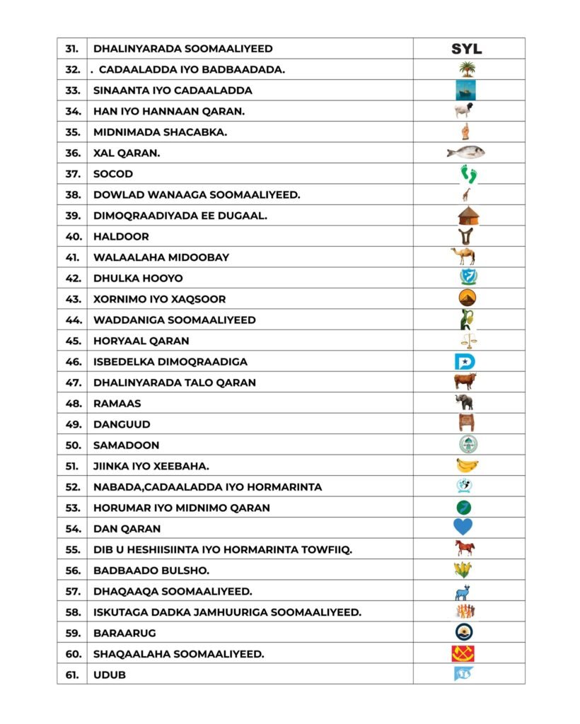 Xafiiska Diiwaanhayaha Guud ee GMDQS wuxuu ogeysiinayaa dhammaan Ururrada Siyaasadda in Guddigu soo dhammeystiray hubinta iyo diiwaangelinta astaamaha (Symbols) sida ku cad lifaaqa qoraalkan, kuwaas oo ay ururradu ku geli doonaan doorashada goleyaasha deegaanka, sida ku qeexan Sharciga Doorashooyinka Qaranka.