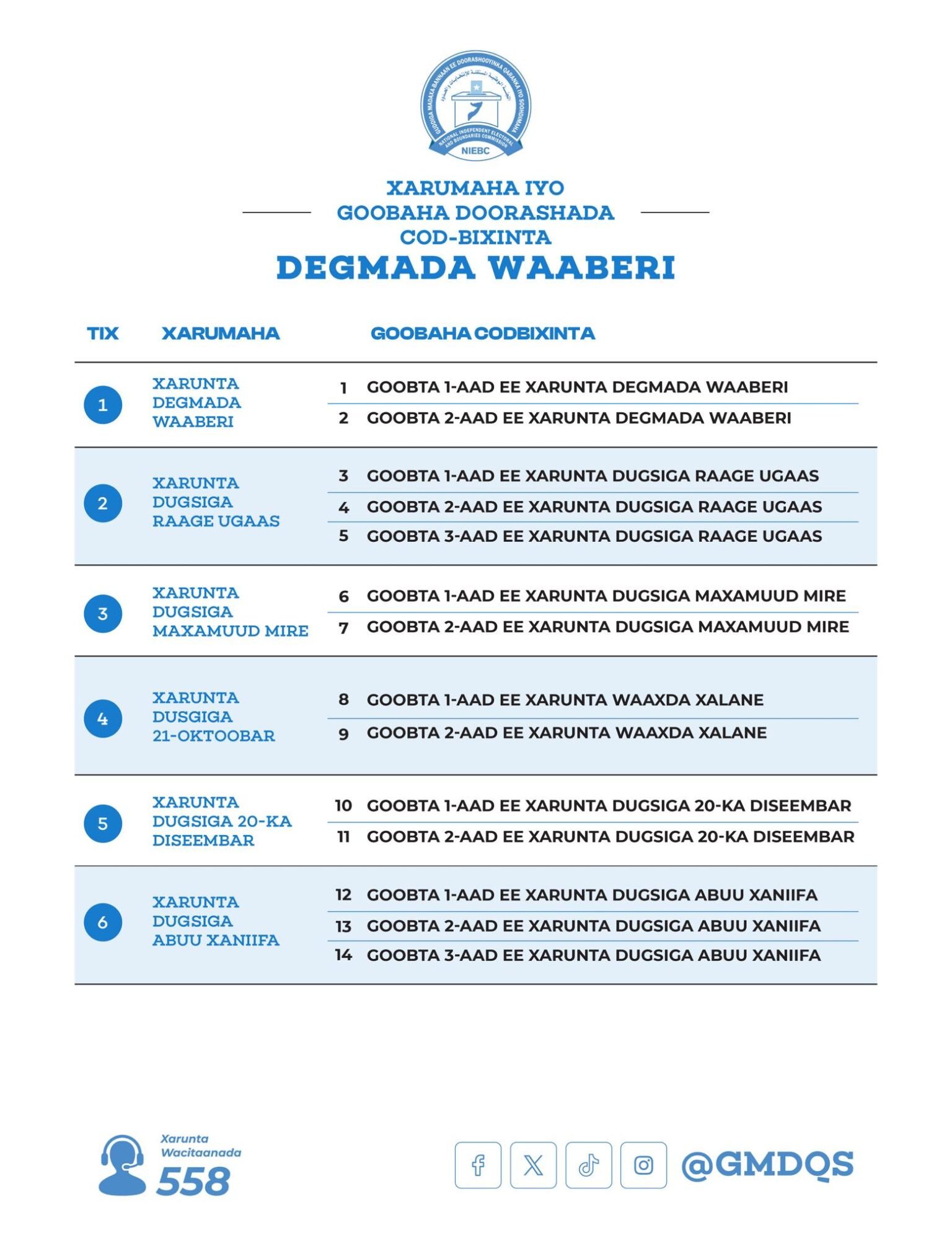 Degmada Waaberi waxay u diyaarisay xarumo dhowr ah oo loogu talagalay doorashooyinka sannadkan, si muwaadiniintu ugu codeeyaan si fudud oo nabad ah. Goobaha ugu muhiimsan waxaa ka mid ah Xarunta Degmada, Dugsiga 21-ka Oktoobar, iyo Garoonka Waaberi, kuwaas oo loo dooray inay u dhowyihiin dhammaan xaafadaha. Markaad tagto goobta codaynta, raadi ururka aad taageersan tahay ka dibna ku calaamadee calaamadda saxda ah (✓) sanduuqa loogu talagalay. Maamulka degmada iyo laamaha amniga ayaa dammaanad qaadaya hufnaanta iyo nabadgelyada guud ee goobahaas. Codkaagu waa muhiim, ee ka qaybqaado dhismaha mustaqbalka degmadaada.