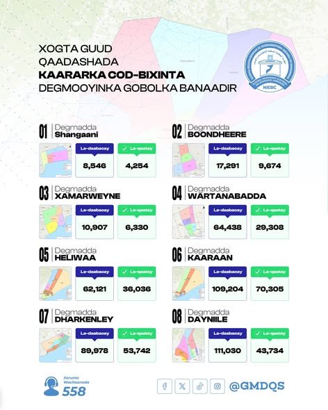 Gobolka Banaadir wuxuu si rasmi ah u bilaabay wejiga qaybinta kaararka cod-bixinta ee doorashooyinka 2025, iyadoo degmo kasta loo qoondeeyay xarumo gaar ah oo loogu talagalay in muwaadiniintu ay ka helaan aqoonsigooda doorasho. Shacabka ku nool degmooyinka gobolka waxaa looga baahan yahay inay uturaan xafiisyada maamulka degmada iyo goobihii ay horey isaga diiwaangeliyeen, si ay u qaataan kaarka rasmiga ah ee u oggolaanaya inay ka qaybqaataan doorashada goleyaasha deegaanka. Kaarku waa muhiimadda koowaad ee lagu xaqiijinayo hufnaanta cod-bixinta iyo ka hortagga is-dabamarin kasta, waxaana muwaadin kasta loogu baaqayaa inuu ilaaliyo muddada loo asteeyay qaadashada si uusan u lumin xaqa uu u leeyahay inuu saameyn ku yeesho mustaqbalka maamulka caasimadda. Guddiyada doorashada iyo laamaha amniga ayaa u diyaariyay agab iyo habraac fududeynaya in qaybintu u dhacdo si habsami leh oo ku dhisnaan kalsooni.